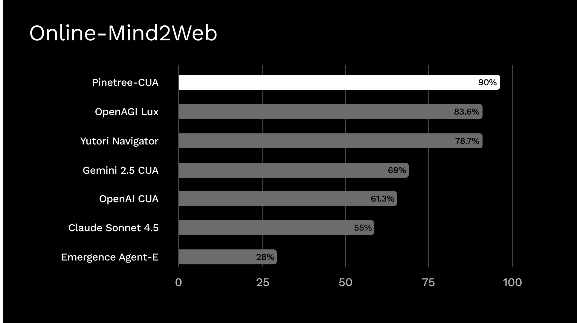 Pinetree Agent achieves 97%, setting frontier-level performance on one of the field’s most demanding browser-use evaluations. At this level, failure rates become exceptionally low, indicating near-production reliability for complex web workflows.